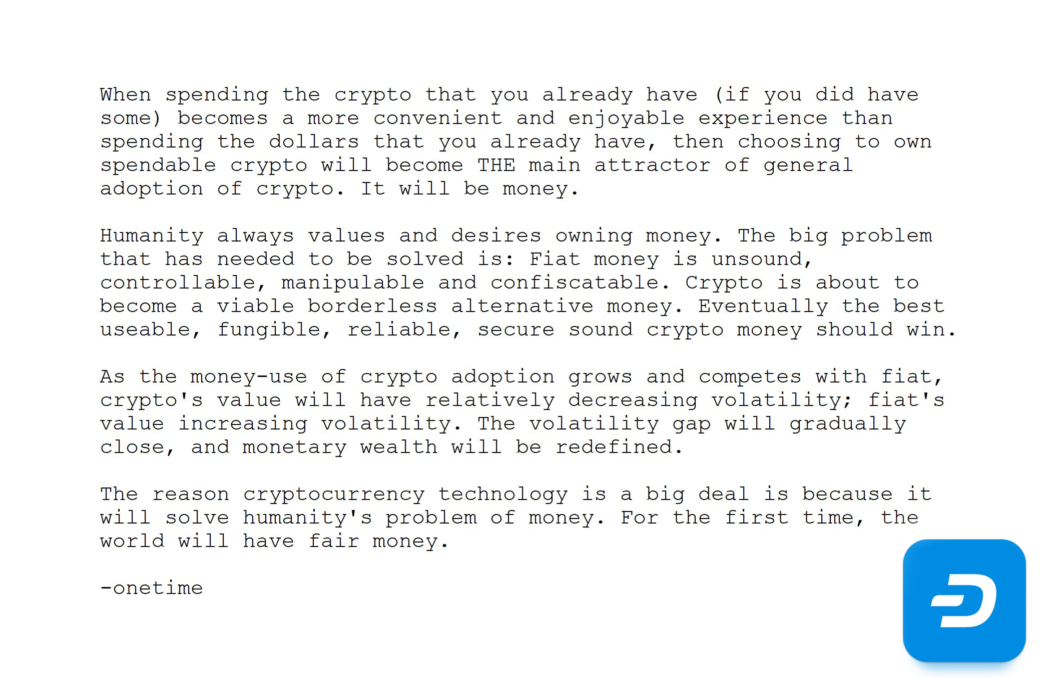 You can hodl Dash as an investment, and you can always use Dash as money.